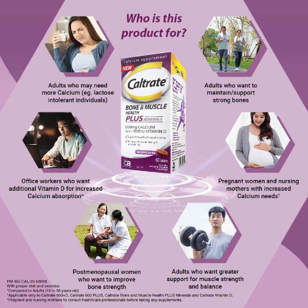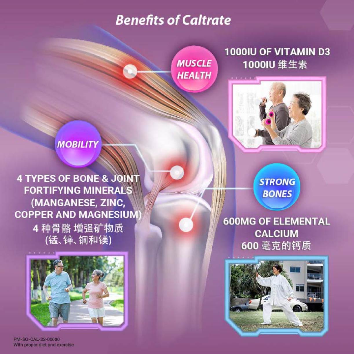 Caltrate® BONE & MUSCLE HEALTH PLUS MINERALS contains, 600mg elemental calcium, 1.5x more Vitamin D at 1000IU and 4 bone fortifying minerals for stronger bones and greater mobility
