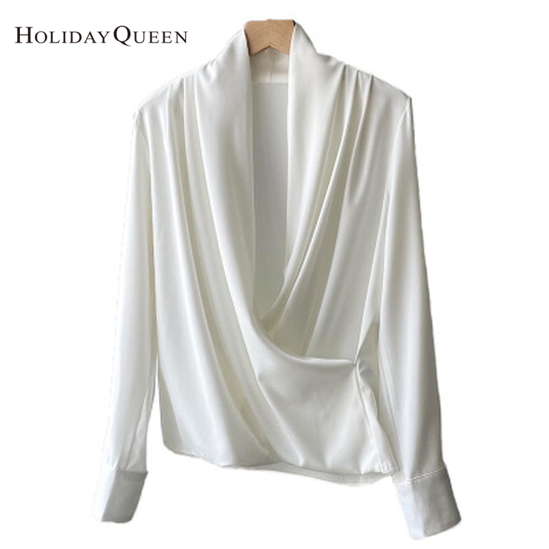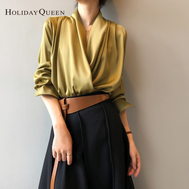 HolidayQueen Satin V-neck Shirt Women Fall French Style Elegant Drape Long-sleeved Shirt Free Shipping HQ10335