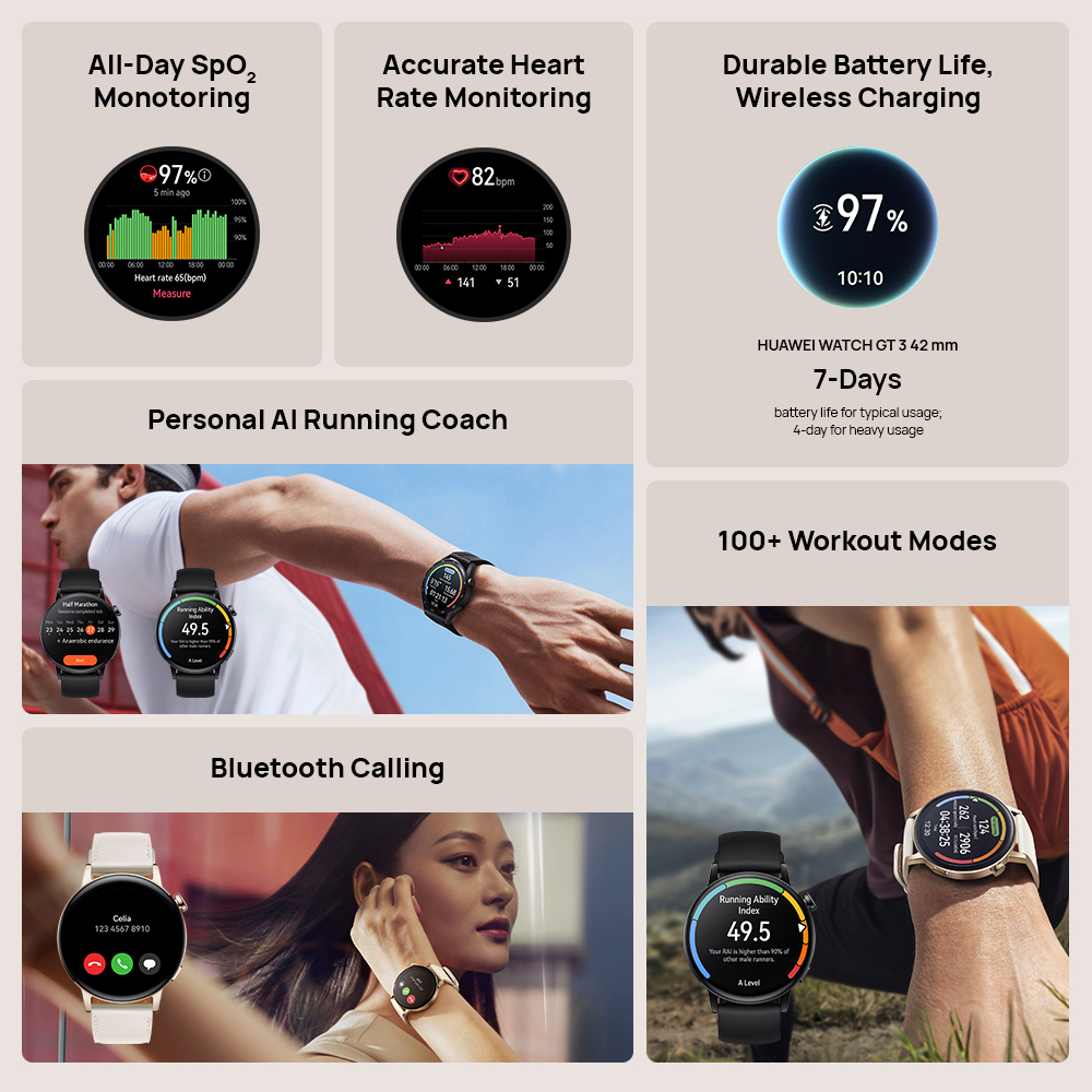 【Personal AI Running Coach】The HUAWEIWATCH GT 3 smartwatch can assess your athletic ability based on your historicalrunning data, and provide you with a scientific and professional running planfor your daily running and race preparation, whether you are a beginner or anadvanced runner, and provide you with full tracking guidance.