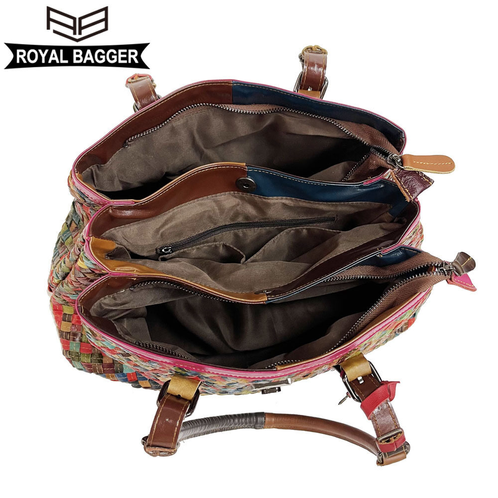Royal Bagger New Top-Handle Bags for Women Genuine Leather Casual Retro Ladies Tote Bags Large Capacity Weave Girl Shoulder Bags