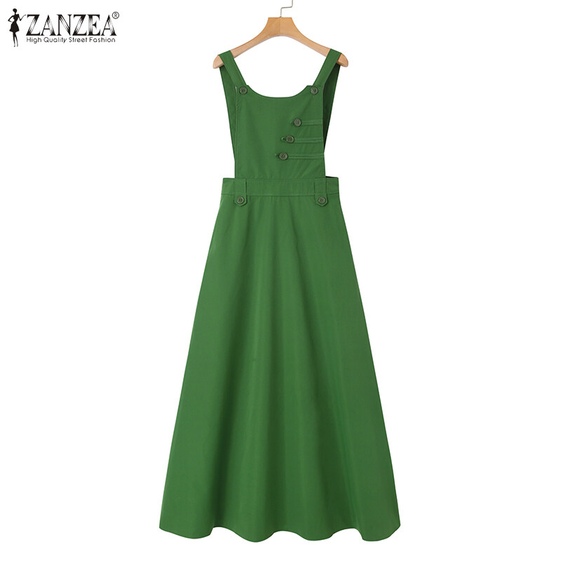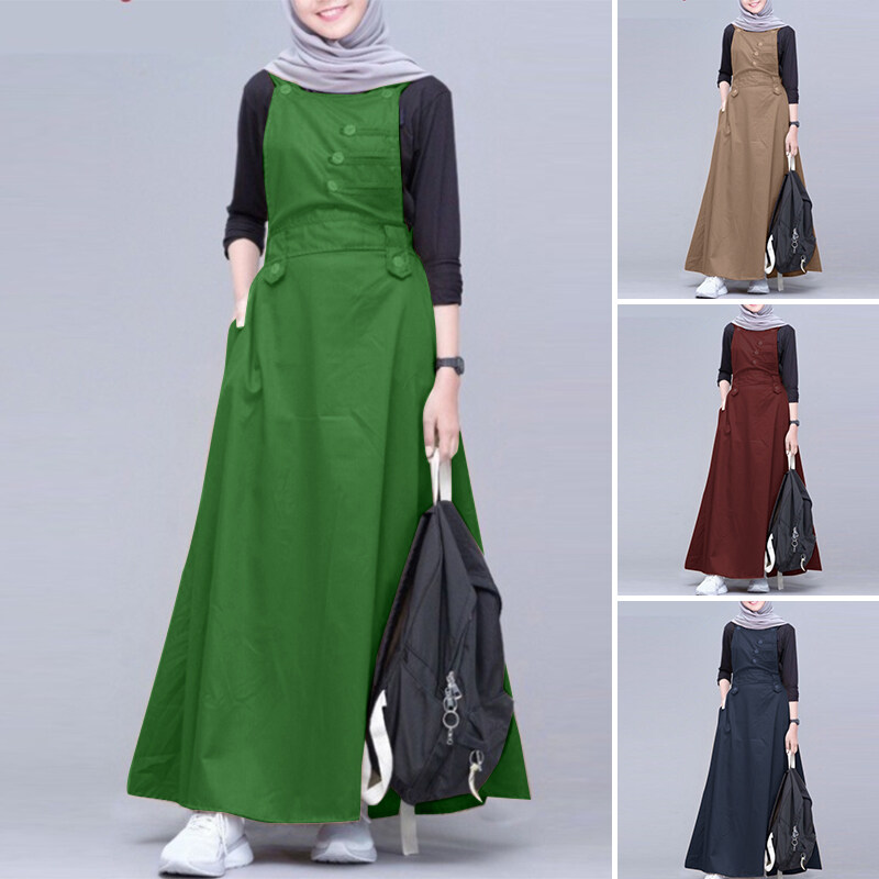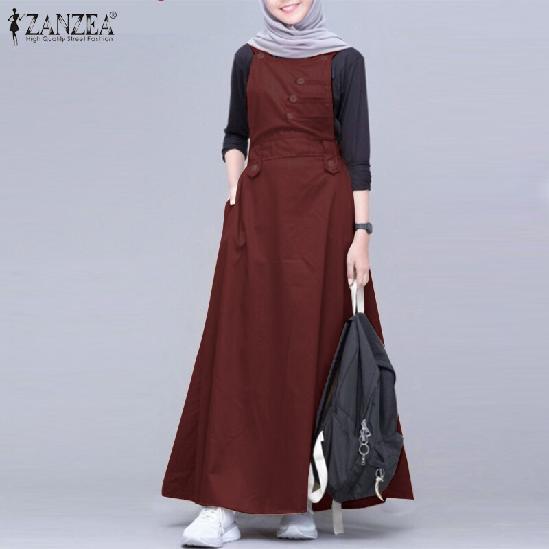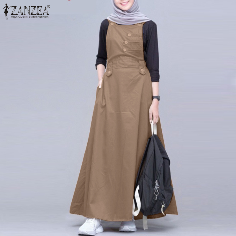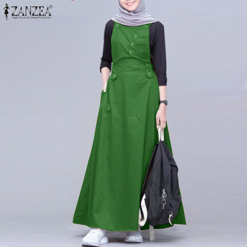 ZANZEA Muslimah Women Muslim Sleeveless Buttons A-Line Plain Maxi One-piece Cami Dresses