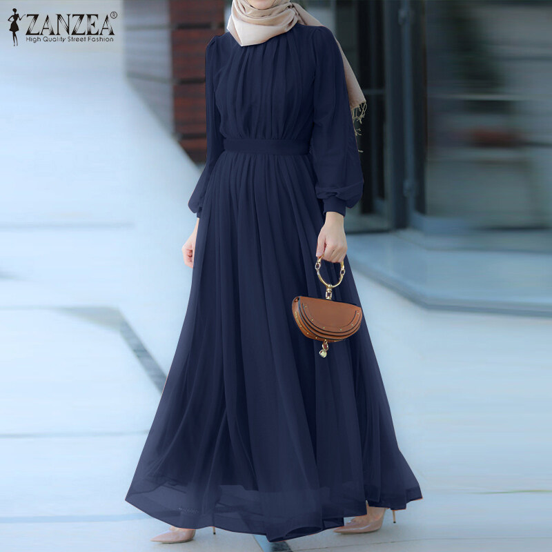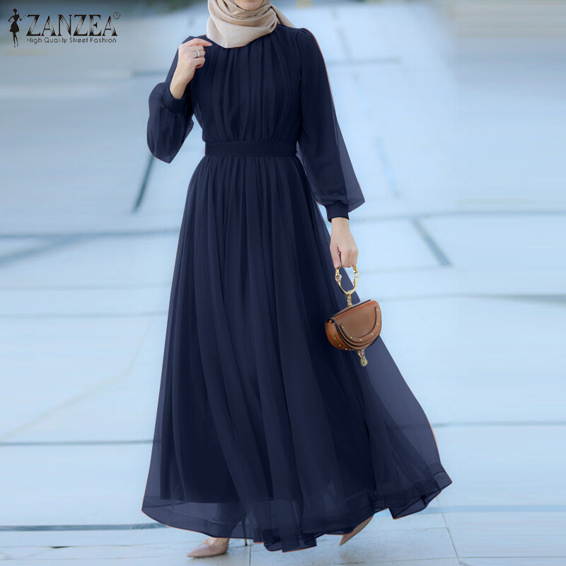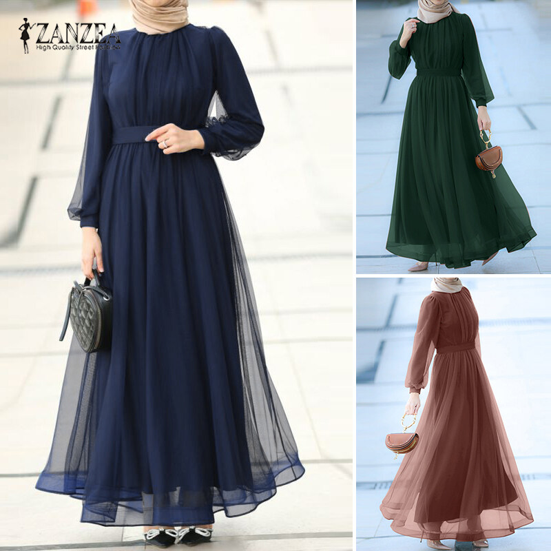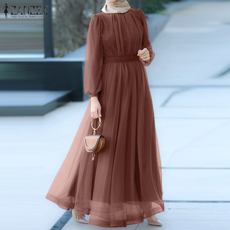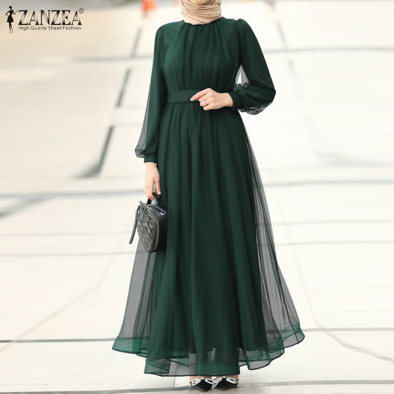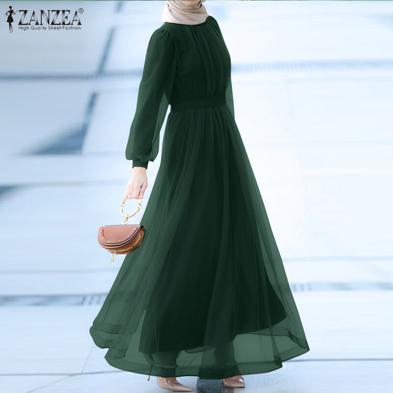 ZANZEA Muslimah Women Muslim Long Sleeve A Line Mesh Sheer Elegant Prom Maxi Dress