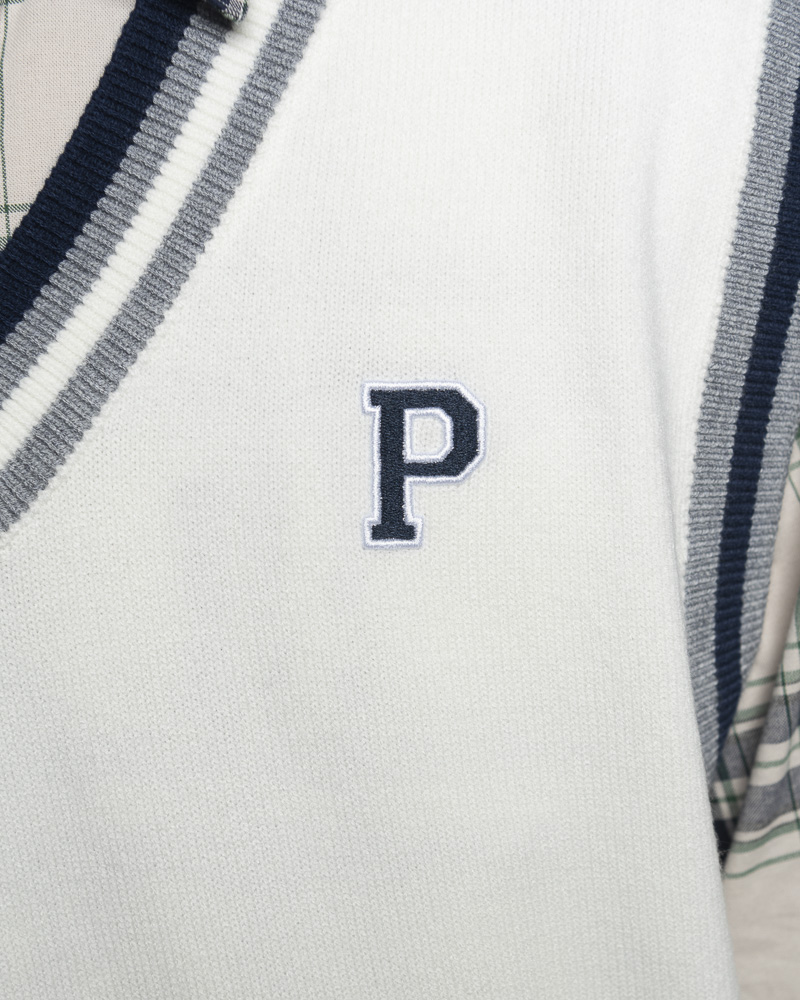Regular Knitted Round V Varsity Vest With Asymmetrical Contrast Coloured Neckline and Hem. Comes with Letter P Embroidery at the front. Made of cotton.