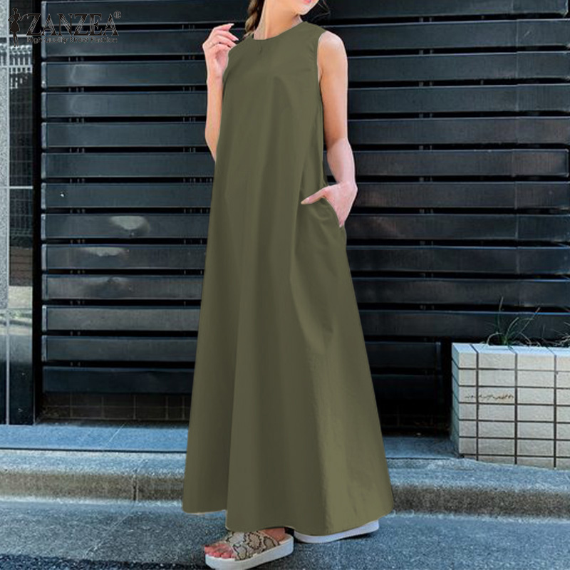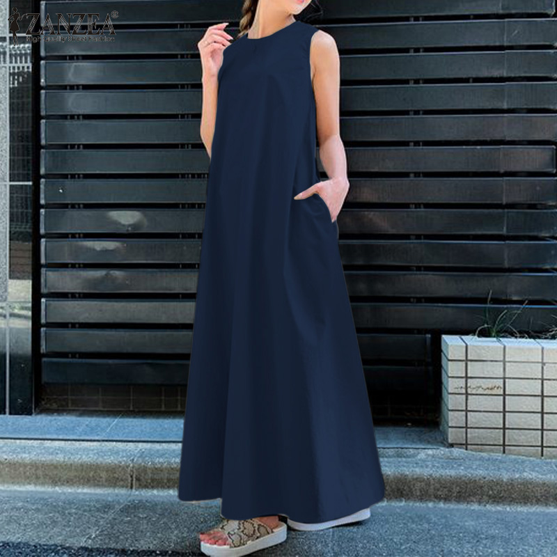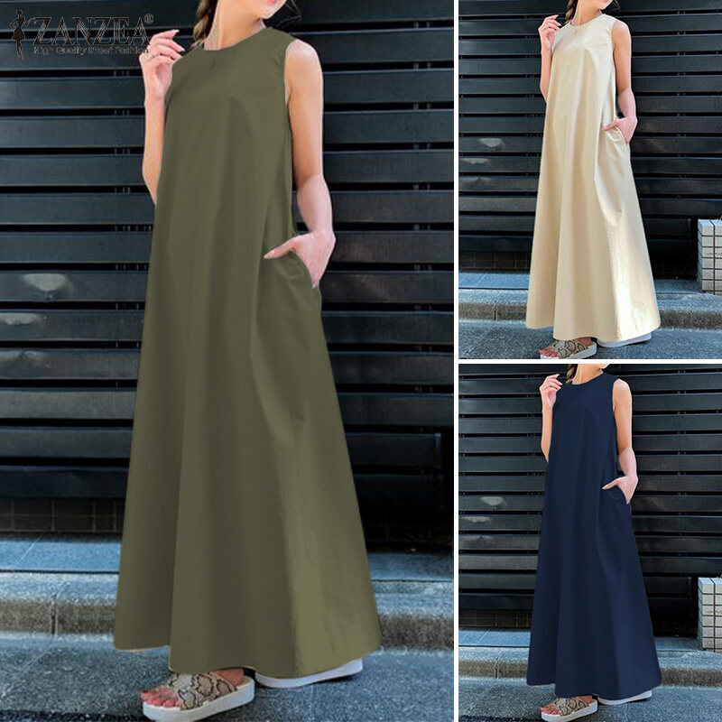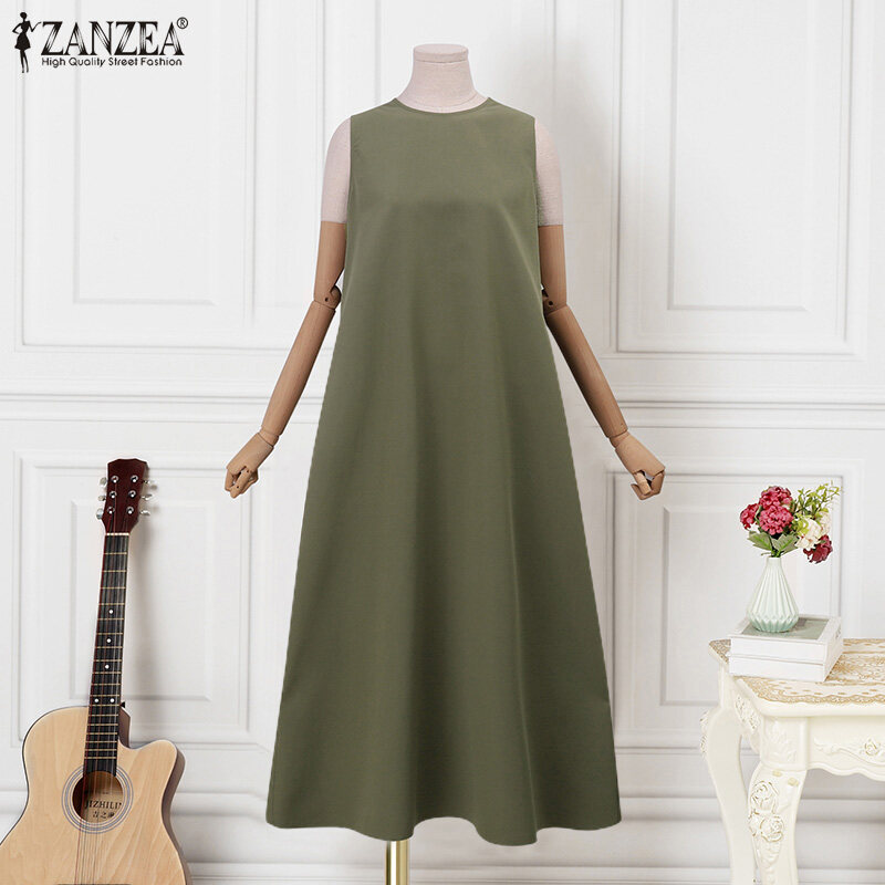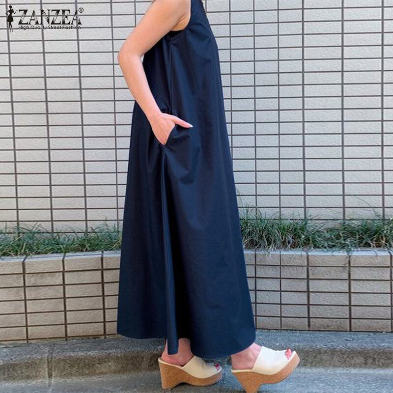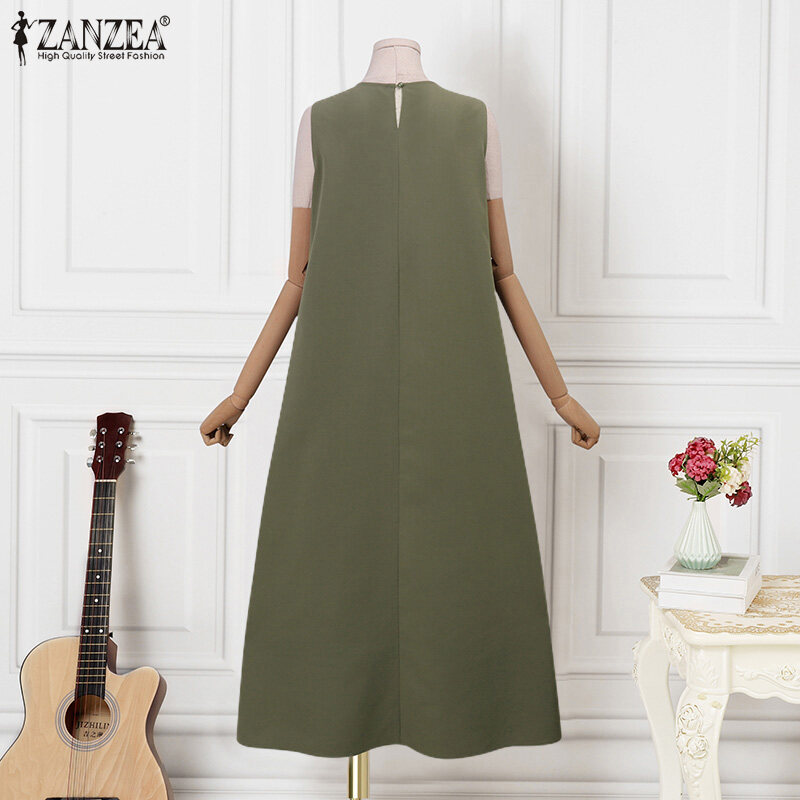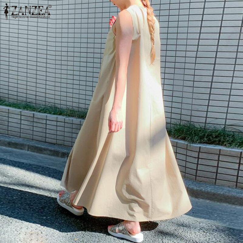 ZANZEA Korean Style Women's Dresses Vintage Sleeveless A-Line Loose O-Neck Maxi Tank Sundress #8